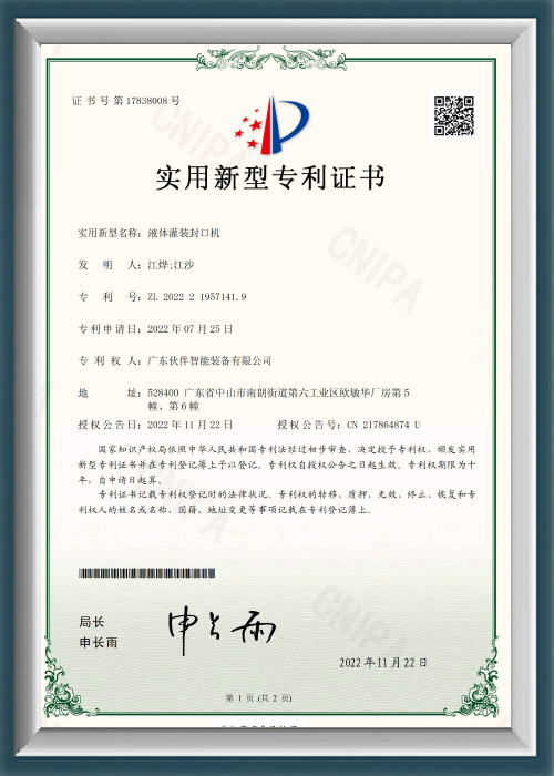 ZL2022219571419 - Liquid Filling and Sealing Machine - Utility Model Patent Certificate