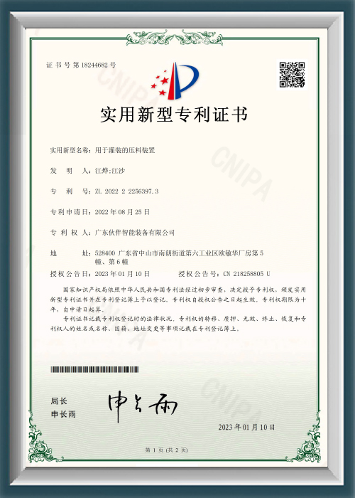 ZL2022222563973 - Compressing Device for Filling - Utility Model Patent Certificate